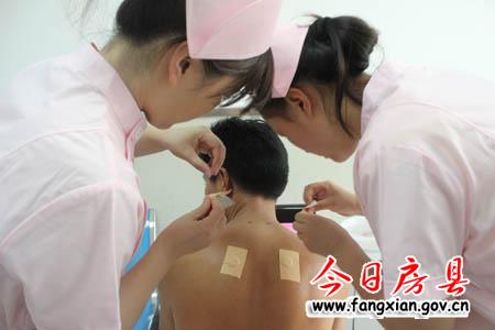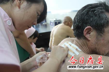 今日房县网讯 记者杨鹏 实习生宋微微报道:13日,县中医院开展“冬病夏治”诊疗活动,500余名患者陆续前来接受治疗。中医专家根据患者病症,在其背部、手部等部位标记出相应穴位,医护人员按照标记为患者贴上自制药膏。